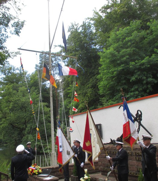Mit dem erklingen der beiden Nationalhymnen wurden die Flaggen auf Halbmast gesetzt den Toten gedacht und die Kranzniederlegung durchgeführt.