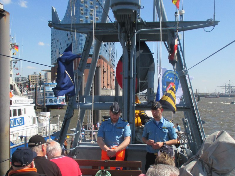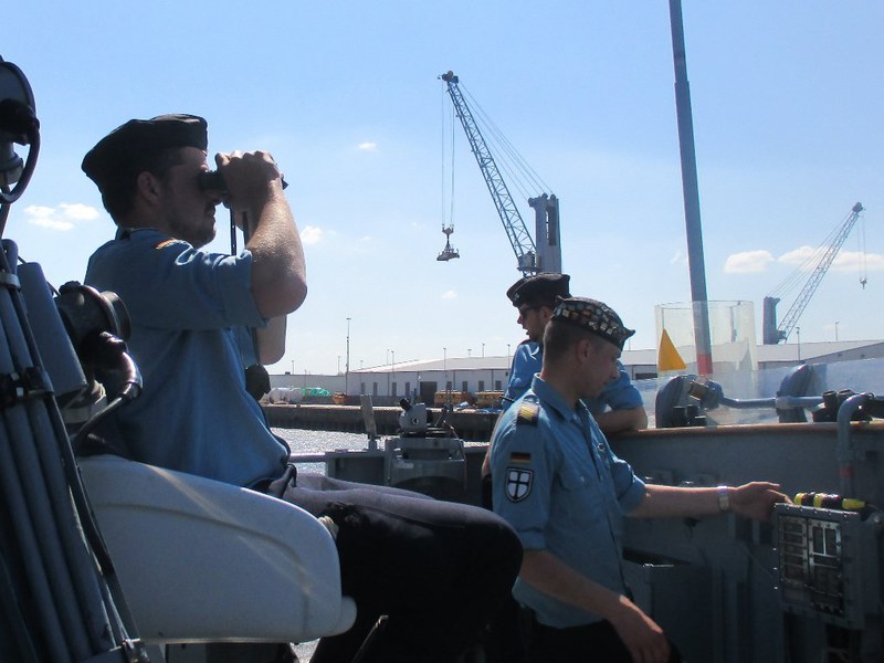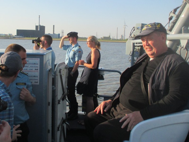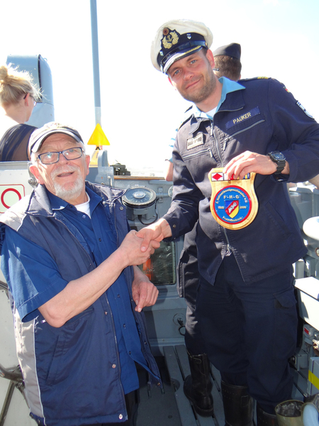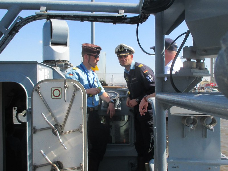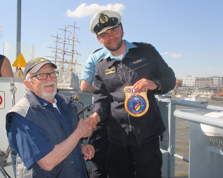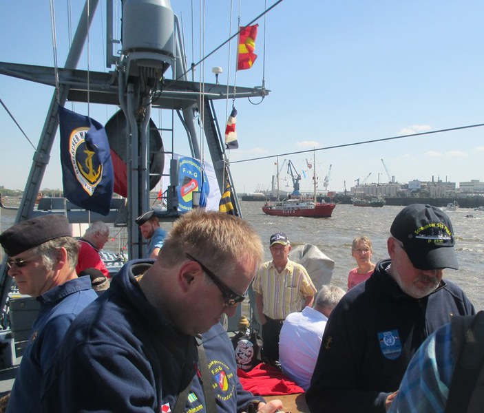 Der Kommandant KptLt. Pauker und der Elblotse verlegten das Boot nun auf den vorgesehenen Liegeplatz, den wir bis Start halten mussten. Da dies mitten im Strom war, hörte man auf der Brücke andauernd Kommandos und der Platz um uns herum füllte sich immer mehr. Nun waren Schiffe und Boote jeder Art, jeder Größe und jeden Alters auf dem Wasser dazu noch hunderte Freizeitkapitäne. Während der Wartezeit nutzten wir die Gelegenheit, um uns beim Kommandanten zu bedanken, Torsten Kuhlmann übergab eine Vereinsmütze mit Vereins-Pin. Mario Weber übergab unser Wappen, auf der Rückseite waren die Namen der Teilnehmer, das Boot auf dem sie gefahren sind und die Dienstzeit an Bord.