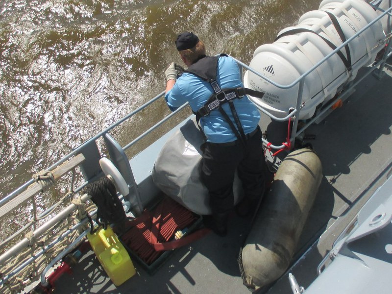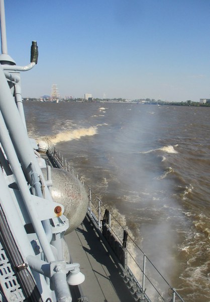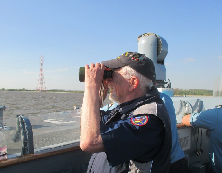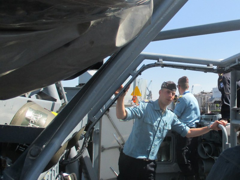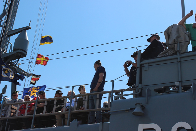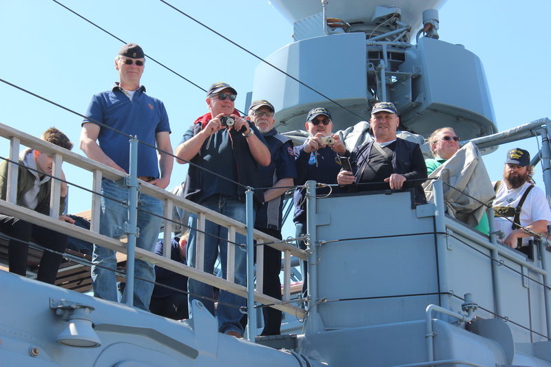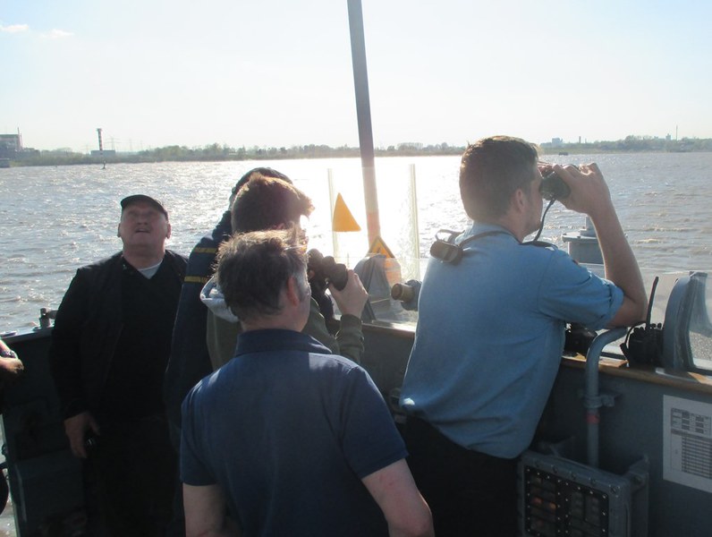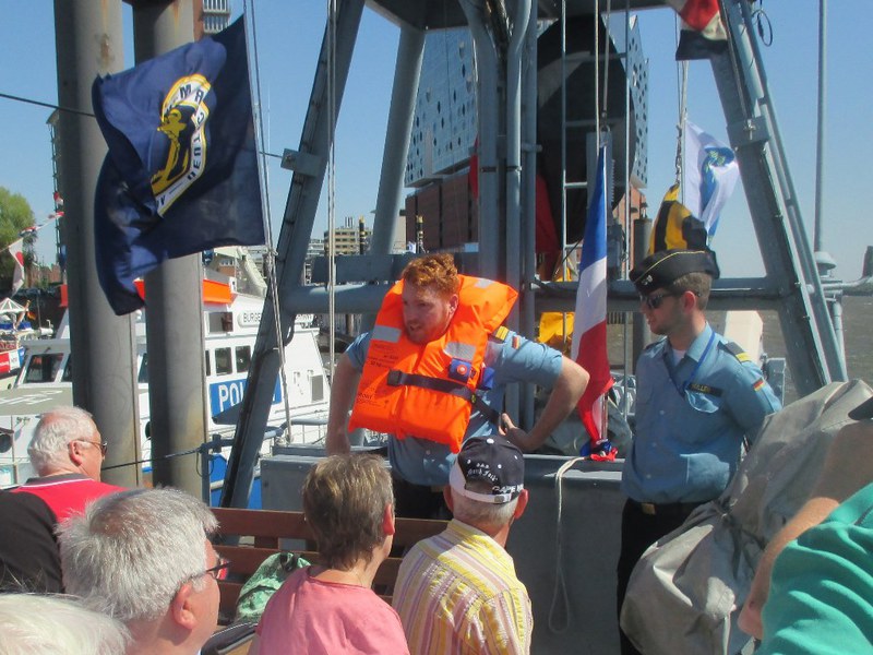 Der Kommandant KptLt. Pauker und der Elblotse verlegten das Boot nun auf den vorgesehenen Liegeplatz, den wir bis Start halten mussten. Da dies mitten im Strom war, hörte man auf der Brücke andauernd Kommandos und der Platz um uns herum füllte sich immer mehr. Nun waren Schiffe und Boote jeder Art, jeder Größe und jeden Alters auf dem Wasser dazu noch hunderte Freizeitkapitäne. Während der Wartezeit nutzten wir die Gelegenheit, um uns beim Kommandanten zu bedanken, Torsten Kuhlmann übergab eine Vereinsmütze mit Vereins-Pin. Mario Weber übergab unser Wappen, auf der Rückseite waren die Namen der Teilnehmer, das Boot auf dem sie gefahren sind und die Dienstzeit an Bord.