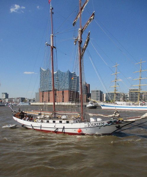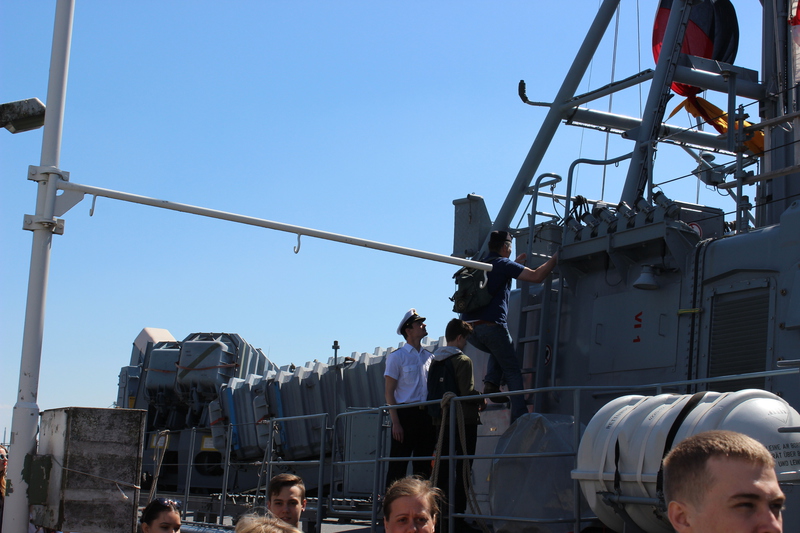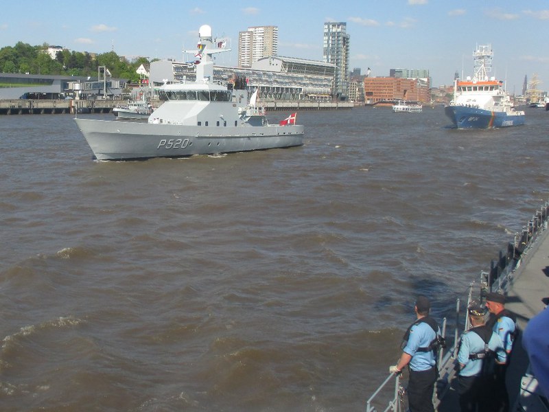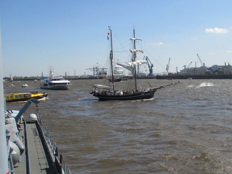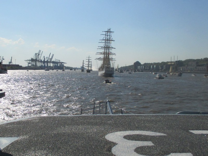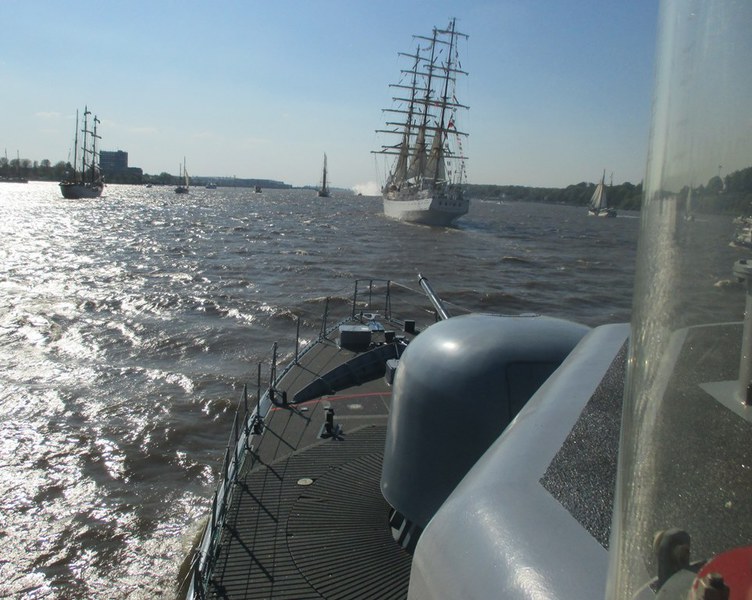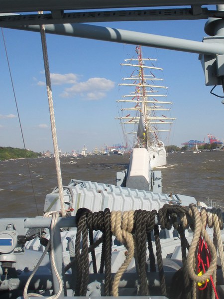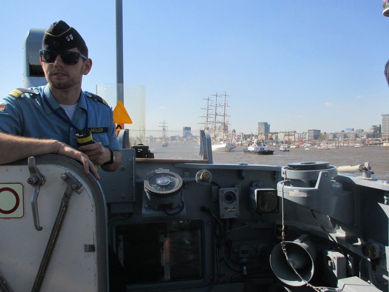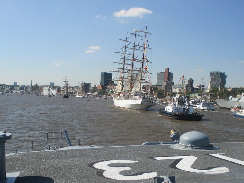 Um 16 Uhr startete die Auslaufparade, in Höhe des britischen Zerstörter DUNCAN hieß es dann Front nach Steuerbord, querab zur Landungsbrücke erklang für uns die Nationalhymne. An den Ufern verfolgten Zigtausende die Parade und winken uns zu, zwischendurch servierten die Backschafter Kaffee und Kuchen. In der Zwischenzeit hatten sich alle mit dem Boot vertraut gemacht und nahmen Plätze auf der Brücke ein.