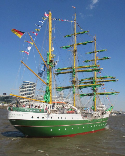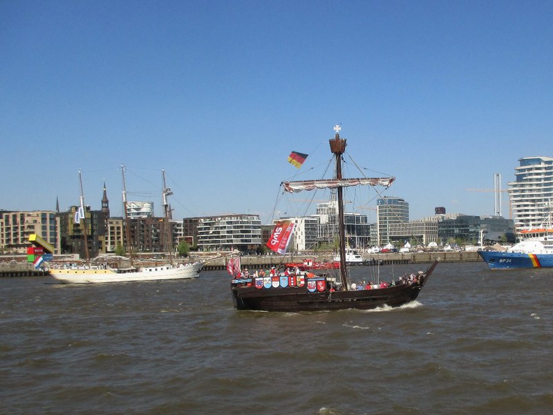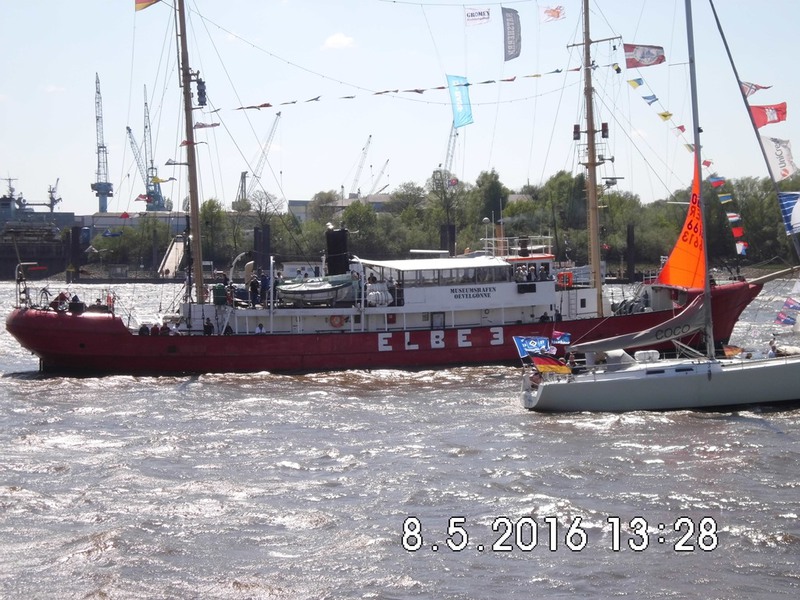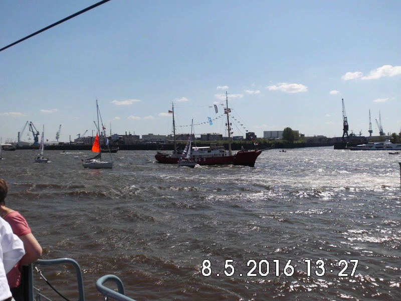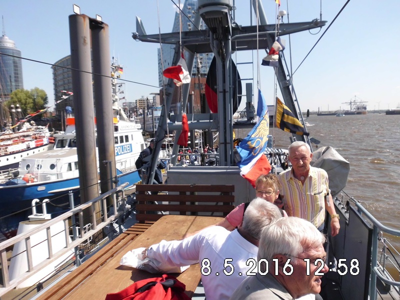 TIME TO SAY GOODBYE klang es am Sonntag den 8.5.2016 über die Elbe in Höhe der Landungsbrücke, als die Auslaufparade zum 827. Hamburger Hafengeburtstag begann. Angeführt wurden die etwa 300 Schiffe und Boote der Parade von der SANTA MARIA MANUELA einem Viermastgaffelschoner aus Portugal. Aber nun zur Abfolge: durch unseren Ari Michael Scheer sind 10 S-Bootfahrer in den Genuss gekommen bei der Auslaufparade auf dem S-Boot HERMELIN mitzufahren. Um 14 Uhr wurden die S-Bootfahrer des Freundeskreises auf der Überseebrücke herzlich von dem Organisator Michael Scheer und seiner Frau empfangen, danach ein Gruppenfoto mit Flagge vor dem Boot. Endlich kam der ersehnte Moment wo wir an Bord durften und wir wieder S-Bootplanken unter den Füssen hatten. An Oberdeck wurden alle Gäste begrüßt und es gab die Sicherheitsbelehrung, Handhabung der Schwimmwesten wie gehabt. Der Signäler erhielt unsere Vereinsflagge, die er neben den anderen Flaggen am Signalmast hisste, die Flagge HOTEL zeigte an das ein Lotse am Bord war. D-R-C-G am Mast waren das Erkennungszeichen. Das Boot legte ab und dies war wieder so ein Moment der die Herzen der Ehemaligen frohlocken ließ, auf der Überseebrücke und an Bord vermischte die Luft mit einen herrlichen Dieselgeruch.