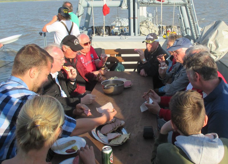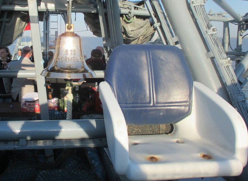 Nach Auflösung der Parade setzten wir unsere Fahrt in Richtung Schleuse Brunsbüttel fort und wir konnten jetzt die Geschwindigkeit erhöhen. Fast ohne besondere Vorkommnisse verlief die Fahrt auf der Elbe, einmal musste voll Stopp gemacht werden, weil uns ein Segler quer vor den Bug lief. Jetzt war auch Zeit für einen Imbiss, Bratwürstchen und belegte Brote wurden an Deck gereicht. Kurz vor der Kanalschleuse kam der Lotse an Bord, klar zum Anlegen an Backbord. Nachdem das Boot in der Schleuse festgemacht hatte, hielt der 1 WO die Abschiedsrede. Um 19:30 ging es von Bord. Ein herrlicher Tag den uns niemand mehr nehmen kann ging zu Ende, und mit Wehmut schauten wir auf das schlanke graue Boot, denn es war eine der letzten Fahrten der HERMELIN. Die Ära der S-Boote geht dieses Jahr zu Ende.